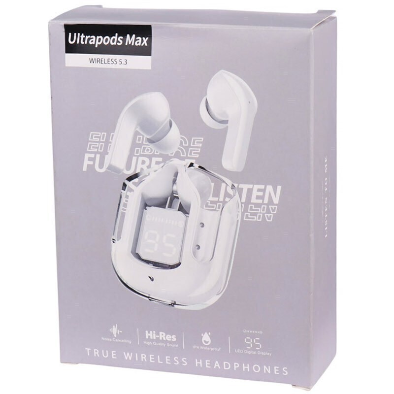 هندزفری بلوتوثی Ultrapods Max هندزفری بی سیم دوتایی مدل Ultrapods Max محدوده پاسخ فرکانسی برابر با 100 هرتز الی 10 کیلوهرتز، برخوردار از درایور های 8 میلی متری مقاوم در برابر آب و گرد و غبار با گواهی IP4، دارای نمایشگر دیجیتال، پشتیبانی از کیفیت Hi-Res بدنه ساخته شده از جنس پلاستیک باکیفیت، مقاوم در برابر آسیب های احتمالی همچون ضربه و فشار امکان شارژ مجدد توسط پورت Type-C و کابل همراه، شارژ گوشی ها از طریق قرارگیری در کیس شارژ همراه تامین انرژی توسط باتری داخلی با ظرفیت 200 میلی آمپر ساعت و ظرفیت گوشی معادل 30 میلی آمپر ساعت میزان شارژدهی در حالت پخش موسیقی و مکالمه حدود 3 الی 4 ساعت و در حالت استندبای تقریبی 300 ساعت طراحی ارگونومیک جهت جلوگیری از خستگی و احساس راحتی در استفاده طولانی مدت، همراه با سری های سیلیکونی اتصال بی سیم توسط بلوتوث نسخه 5.3 با برد حدود 10 متری، پشتیبانی از پروتکل های بلوتوث HFP/HSP/A2DP/AVRCP دارای میکروفون داخلی جهت انجام مکالمه با امکان کاهش نویز، سازگار با قابلیت TWS جهت استفاده تکی یا جفتی از گوشی ها