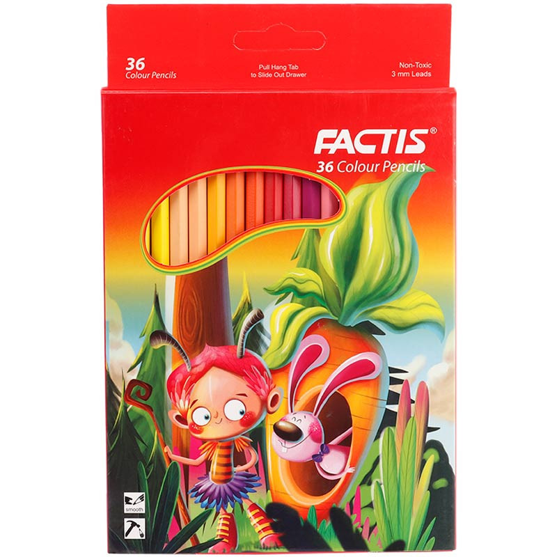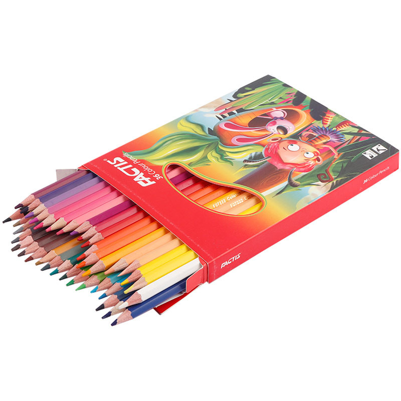 بسته بندی مقوایی متشکل از 36 مداد رنگی، دارای بدنه چوبی مقاوم، نوک نرم و پررنگ و روان دارای سطح مقطع گرد، مغزی با مقاومت بالا در برابر شکستن و قابلیت تراش کردن آسان