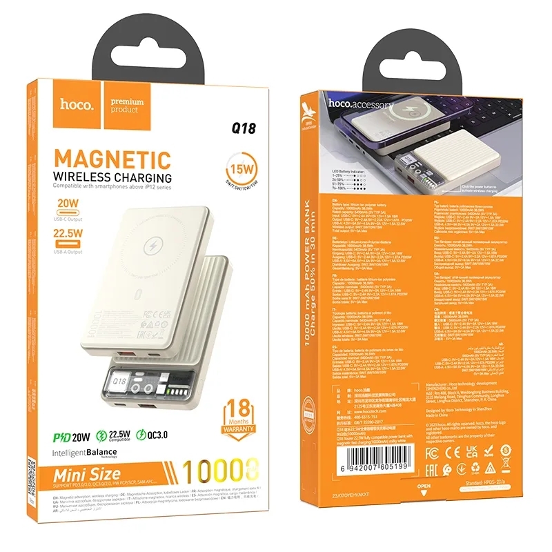 پاوربانک مگ سیف 22.5 وات فست شارژ هوکو مدل Q18 ظرفیت 10000 میلیآمپرساعت
